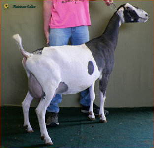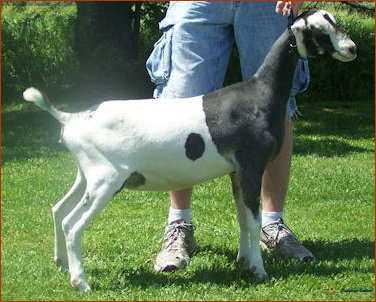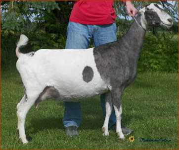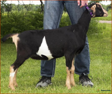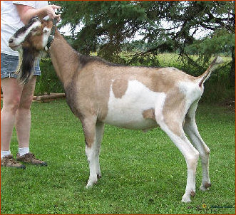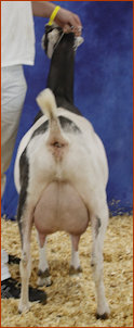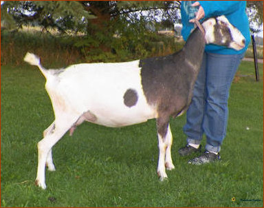 What a year Snickers has had in the show ring...despite her severe hoof injury last summer! She has been 4X 1st place 2 year old, 1X 2nd place 2 year old, 3X GCH, 1X BOB and BUOB at the Iowa State Fair. She easily finished her permanent championship this summer and just seems to be getting better as the summer progressed. We simply love this young doe!