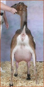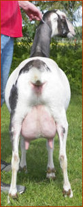 Snickers excels in dairy strength. She is sharp over the withers, long and lean in the neck, smoothly blended in her shoulders with great spring of rib and width in chest and escutcheon. She stands on very correct feet and legs. We just love this doe and can't wait to see her fresh in 2017. Her dam is a very tall, dairy doe with a stunning mammary and lots of udder capacity and will to milk, topping her 2016 lactation at 16# for 3 straight milk tests.