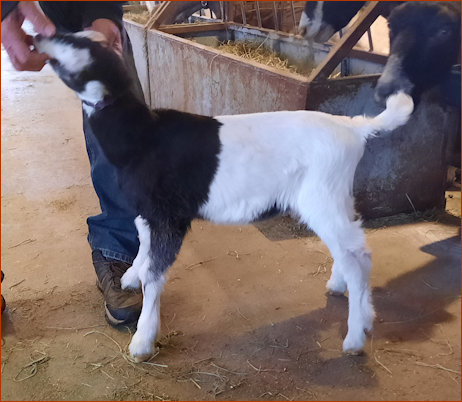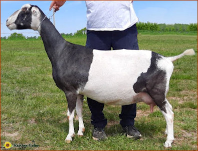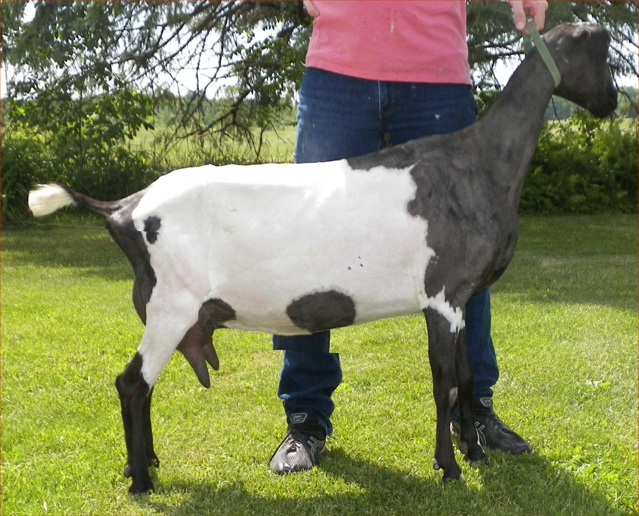 Snickers had an extremely difficult kidding in 2019 with a huge single doe kid and it took her forever to snap back. Consequently she did not milked like she has in the past, although nothing has affected her appetite. We felt she is a bit "fluffy" this year due to her lower milk production. We look forward to hopefully a much easier kidding that will get her back into shape next year. This is a huge, powerful doe!